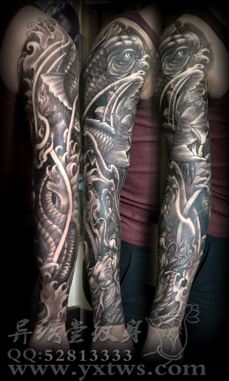 花臂黑白传统鲤鱼龙